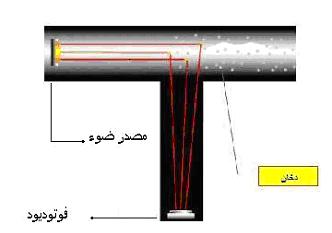 - التفــــســــــير: في حال تواجد دخان كثيف فإن هذا الدخان سوف يدخل من الجهة المقابلة التي تحوي على المصدر الضوئي فيصطدم الضوء الصادر من الديود بجزيئات الدخان فيتشتت وينعكس على الفوتوديود و بالتالي سيتم تفعيل الدارة الإلكترونية صادرةً صوت المنبه . أما تعليل الوضع القائم بين الديود و الفوتوديود هو كالتالي : إذا كانت الزاوية أكبر من 90 أو أقل منها فإن جزيئة الغاز ( الدخان) التي تصطدم بالشعاع الضوئي قد تنحرف عن المسار المؤدي إلى الفوتوديود فلذلك لا يتم تفعيل الدارة الإلكترونية وتصطدم بجدار الأسطوانة فلذلك أفضل وضعية هي أن يكون الفوتوديود و الديود (المصدر الضوئي) متعامدان......